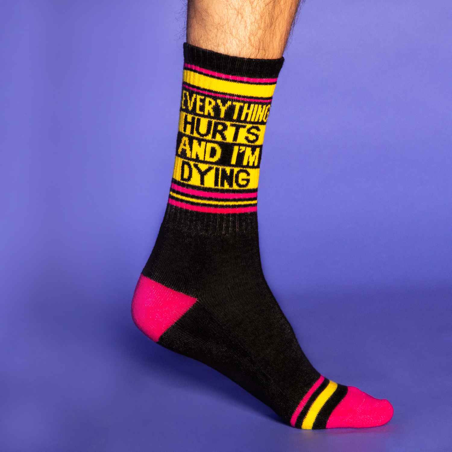 These super-comfy, unisex, one-size-fits-most, Gym Socks are made in the USA of Black Cotton with accents of Deep Pink Cotton, Yellow Nylon.